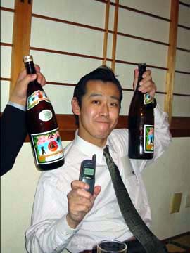 2 焼酎で御機嫌のHとM。焼酎と美味い地鶏料理を前にして、御満悦。 | 3 満面の笑みをうかべるH。 それもそのはず、本日の焼酎は「伊佐美」が2升!! 店のおじちゃんからの差し入れでした。ありがとう!! |