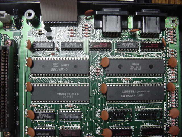 CPU周辺です。CPU には SHARP のセカンドソース品の Z80、音源には YAMAHA の YM2149 (SSG: GI社 AY-3-8910(PSG) 相当品)、PPI(周辺機器インターフェース)には NEC の 8255 が見えます。上部のコネクタは JOY STICK 端子です。