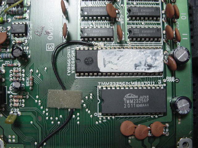 VDP周辺です。VDP らしき LSI の基板には TMS9928A(TMS9918A) という表記がありますが、LSI 上にはシリコングリスが塗られていたので、判読できません。この部分に、放熱板兼シールドの金属板が接触していました。