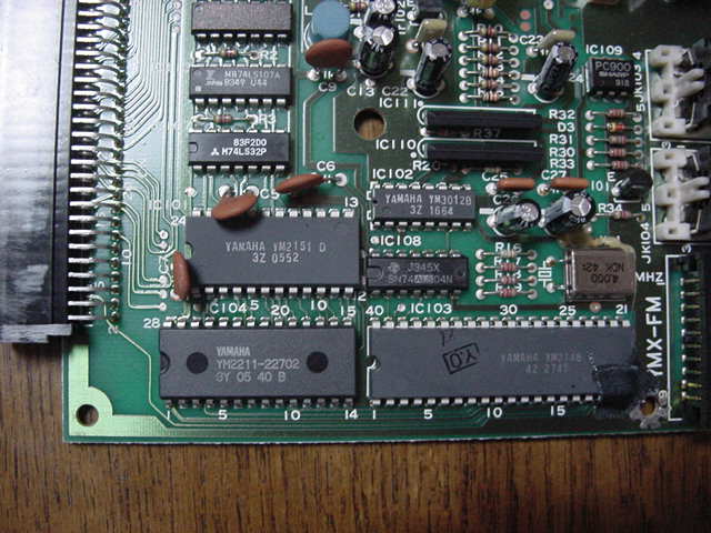 SFG-01 の基板拡大写真です。FM 音源には YAMAHA YM2151 (OPM)、DAC には YM3012 (2ch対応)、MIDI 入出力には YAMAHA YM2148 (MKS) が使われています。