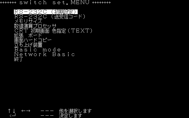 N88-日本語BASIC(86)システムディスクで「switch.n88」をロードし実行すると、このような画面で設定ができます。