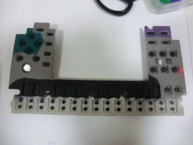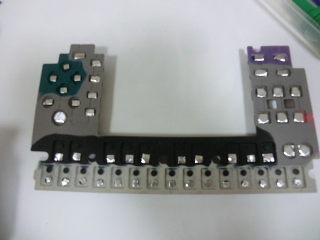 裏の黒い部分が、基板に接触することで通電し、キー入力となる訳ですが、経年劣化で通電しにくくなってきます。これを改善するために、この部分を覆うようにアルミテープを貼ります。