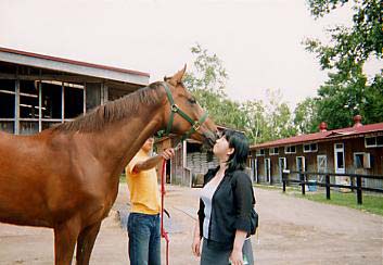 | これは洗い場から帰ってくる時の写真。奥に見える厩舎は今年3歳の牡馬達の厩舎です。左手前の馬房にはサンデー君の子どもでフウジンとかライジンとか……なんかそんな名前が入っている牡馬がいました。とはいえ、女の子達が水浴びしてるときは厩舎の右側の馬房の牡馬達は違うところで放牧?されてたりしたみたいですが…… |