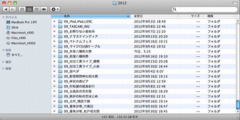 ですが、まだ鯖Macに保存する前は作業用MacBookPro上のシステムとは別にパーテを切ってあるファイル置き場用ボリュームに保存してあるんですが、ここでは上記の「種別」を作っていないため、西暦の下にありとあらゆるイベントのフォルダが発生する訳でして、活動が多ければ多いほどそのフォルダの数が増える事となる訳でして、その意味では9月はちょっとエラい事になってる感じでする。そう、こんな風に。