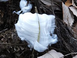 ん?霜柱?華?なんのこと?と思われでしょう、大半の方は。詳細は高尾ビジターセンターの説明に委ねますが、要は茎が枯れた植物で根から吸われた水分が茎の隙間から氷として滲み出るとこういうのが出来上がるとの事でする。