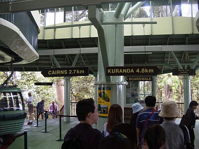 駅で乗り換えです。 その名の通り、Skyrailではここが峠になっており、CaravonicaとKurandaに向けて降りていく2本のゴンドラを乗り継ぐ形になってい ます。 |