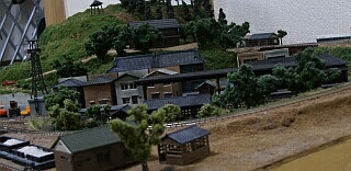 左側の山の中腹にあるのは温泉旅館、真ん中の道沿い左にある木造漆喰塗りのような建物は駅前食堂、その右の塔は防火倉庫と物見やぐらです。