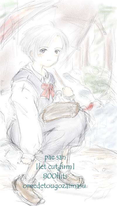 まだ私が1人でページを持つ前に 開設していたサイトでお知り合いになった らいんさんが800HIT記念に描いてくれたものです。 頂いた絵を破棄するなんてトンでもないので、 旧ページのものですが置かせていただきます。