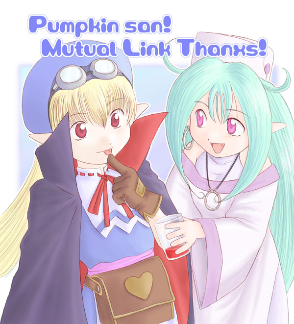 相互リンク記念で、 パンプキンさんに差し上げた絵です。 そろそろCG歴1年半ぐらいになりますが、 初めて純粋にフォトショップのみで色塗りしました。 結論!フォトショップでの着彩は私にゃ向かない! フォトショップはホンマに色設計やらレイアウトなりが 頭の中で決まってる人が使うとパワーを発揮するアプリ。 行き当たりばったりの人には使いにくい・・・。
