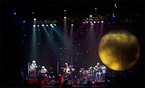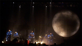 鈴木慶一氏の今回のテーマは「月」と「蛍光灯」だった。東京公演のみになってしまったが、直径5メートルの大きな「月」を作った。その月をバックにメンバーがある時は月面に、ある時はコックピットで作業をしてるという舞台を見立てた演出になった。滑走路を思わせる直線の蛍光灯、その後ろには大きな月が浮かぶ。それらをバックに宇宙服(ジャケットで使用)を着たメンバーが「月面讃歌」をバックに登場する。正直この登場は凄く感動的で良かった。