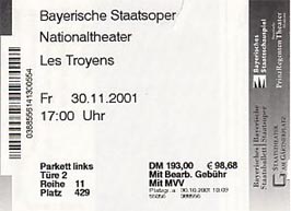さて昨年のザルツブルク音楽祭のトロイはポラスキがカサンドラとディドンを通しで歌いきるという凄さに圧倒されましたが、今年のミュンヘンではポラスキとマイヤーが歌い分けると言う豪華さ。その為か、グルベローヴァ清教徒のチケットは簡単にゲットできたものの、トロイの入手は困難を極めました。運良くゲットできたシートは平土間11列目で音響も抜群でした。