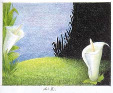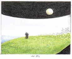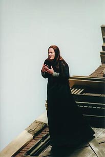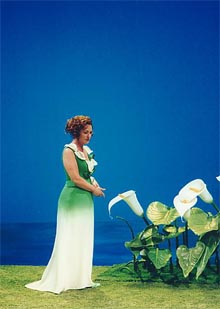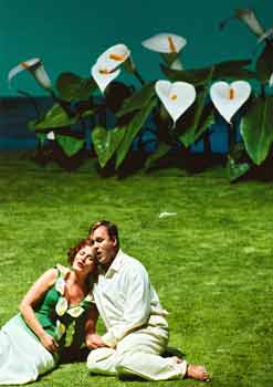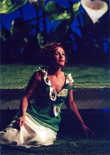 第4幕、王の狩と嵐の場面では緑一色の草原に白い大きな花が咲いていて、遠くに地中海を望む楽園がセットでした。森のニンフ達のバレエがとても美しく、動物的な動きの振り付けが自然の営みを象徴的に描写し、オーケストラの美しさに忘我するといった感じでした。ホルンの奥深い響きと弦が醸し出す躍動感はまさに生命力溢れる音絵巻というところでしょうか。ここで一旦幕が降りて、再び幕が上がると第30番のアンナとナルバルが語る場面。ここでロータリングが歌うナルバルはとても味わい深くドラマチックでした。 続いて女王の入場から有名なバレエの場面。バレエは3つのパートから成り立っていて、カットなしに演じられました。美しいワルツの調べがことのほか素晴らしくて、美しいダンサー達の官能的な踊りとともに至福を楽しむことが出来ました。 そして最大のクライマックスはディドンのエネーの愛の二重唱。マイヤーの美しいディドンは情熱的で、エネーの甘く輝かしい歌とともに、聴くものを恍惚の世界に誘うのでした。幻想的な楽園の背景には夜のとばりが降りてきて、黒の闇が次第に下へと広がってきました。中央に輝く月も金色に光り始め、その情景は言葉を失うほどの別世界。明るい楽園の水平線と夜のとばりがパノラマ画各を描き、ディドンとエネーが浮き彫りとなる情景は素晴らしいの一言でした。そしてメリクリウス神がイタリアへと叫ぶ場面では月が赤色に染まり、続いてやってくる悲劇を予感させました。