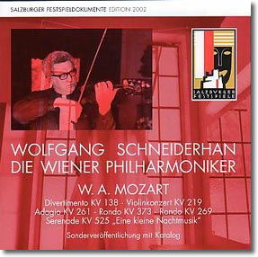 なおウォルフガング・シュナイダーハンがウィーンフィルを指揮してヴァイオリン・ソロも担当したCDも発売されていたのでゲット。こちらは1973年8月4日のモーツァルテウムでのコンサート・ライブでプログラムはモーツァルトのディヴェルティメントK138、ヴァイオリン協奏曲KV219、セレナーデKV525「アイネ・クライネ・ナハト・ムジーク」。さすがにシュナイダーハンの瑞々しいヴァイオリンは惚れ惚れとするほどで、彼のタクトもモーツァルトの魅力を大いに引き出している感じ。