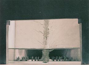 第3幕はステージ前面が白のコンクリート壁のような設定で、大木のシルエットが黒く開口面を広げている。壁は矩形のブロックが積まれたかのように格子模様が入っている。「時間が空間に変わる」というテキストから、この格子パターンは空間に示された重力波の等高線ではないかと勝手に想像したが、ドラマの展開とともに壁はステージ奥に下がり、さきほどの大木状のシルエットは燃えて朽ち果てた木炭のような大木となって現れた。