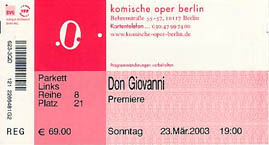 一昨日のベルリン・コミッシェ・オーパーはコンヴィチュニー新演出のドン・ジョバンニの初日公演でした。さすがにコンヴィチュニーのやりたい放題といった斬新・奇抜・刺激さに驚きました。開演前からステージ幕は開かれており、天井には大きな円形の照明管があり、ステージ自体は円形舞台にプラスチック張りの仕切り板が曲線を描いて立っていました。序曲の開始とともに、円形舞台が回転し、小さなモーツァルトがピアノを練習している場面が登場。かたわらに父レオポルドがレッスンしているという場面ですが、父が見ていない間にモーツァルトが悪戯をするといった演出で、ついにピアノを壊し始めるといった有様。続いてピアノの中からベッド衣裳の将来のコンスタンツェと思われる女性が登場し、小さなモーツァルトの手を引いて回転するステージ、誘惑の世界へと歩んでいきました。