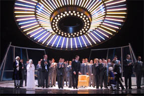 さてドン・ジョバンニも大詰め、雨傘に隠れた騎士長がドン・ジョバンニと腕を組みながら晩餐会へ移動する場面も、回転舞台ととも効果的な設定でした。ともかく爆笑のドン・ジョバンニですが、最後は群集に囲まれステージ下に沈み込んで地獄落ちする訳ですが、最終の15場では、生き返り、再びステージに上がってくるという有様でした。今までは白のTシャツに黄色のガウンという姿だったのが、スーツ姿に変身していました。キューブリックの映画シャイニングに出てくるジャック・ニコルソンが死んだ後で、写真の中でホテルオーナーとして写っているシーンがありますが、それを想起させるかのように、ドン・ジョバンニも群集のドンとしてステージ中央の黄色い椅子に座りながら、皆から慕われながら、最後の6重唱が展開していくのは実に和やかな雰囲気で、憎めないドン・ジョバンニを強調していました。