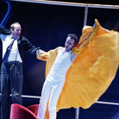 ここで一度幕が降り、序曲終了とともに幕が開くといった展開でした。ディートリッヒ・ヘンシェル演じるドン・ジョバンニはとてもコミカルでユニークなキャラクターでした。騎士長を殺す場面は、ドン・ジョバンニの方から殺すと言うよりも、二人が雨傘で決闘の真似事をして、誤って騎士長に突き刺さって死んでしまうという設定でした。むしろ誰にでもドン・ジョバンニ的運命に出会う可能性があることを示唆しているように感じました。この平凡な奇人をヘンシェルが見事に演じている訳です。これに対してレポレッロは積極的な性格描写で、ドン・ジョバンニの秘書として奔走する役割を演じているのが面白いところでした。