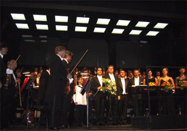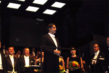 クセイ演出「ティート」のセットを背景した合唱とオーケストラのレイアウトはさすがに壮大な雰囲気です。さすがにムーティの指揮は颯爽としていて引き締まります。90分間のミサ・ソレムニスは休憩なしに演奏されますがが、全く緩むことの無い集中度でした。冒頭20分ほどのキリエに引き続き、グロリアに転じたときの歓喜もひとしおでした。ケルビーニの地味な作風ながらも随所に見られる弦の上昇パッセージの躍動感。こういった箇所ではムーティもウィーンフィルのアンサンブルからエネルギッシュな盛り上がりを引き出し、合唱のパワフルさと相まって極上の響きでした。女性合唱ではなく、ウィーン少年合唱というのも透明感に溢れており、広大なフェルゼンライトシューレも聖堂とはまた違うスペクタクルさを演出しているように感じました。到着初日にして全く眠気を感じない、素晴らしいコンサートで何よりです。
