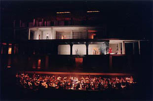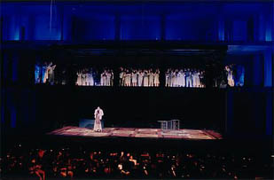 ステージはフェルゼンライトの横長パノラマを目一杯使ったもので、壁を3つの層に分割し、正面1段目がやや大きめの皇帝の部屋。左右に矩形の小部屋を無数に配したスケールの大きなものでした。舞台の大きさにバランスさせるためなのでしょうか、オーケストラも小劇場で演奏するモーツァルトよりも規模が大きいと感じます。アーノンクールが登場し、序曲が始まるかと思った瞬間、2段目の層の中央にシャーデ演じる皇帝ティートが現れ、電話を掛け始めるシーン。呼び出し音が大きく聞こえるものの、誰も出ない為、ティートが落胆する場面が印象的でした。ここから序曲の開始となりました。