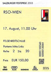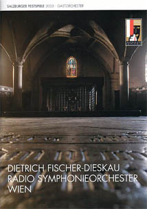 プログラムにはディースカウのザルツブルク公演記録が写真入りで紹介されていますが、何と8ページにも及ぶ公演の数々。デビューは1951年の8月19日、ヴィルヘルム・フルトヴェングラー指揮のウィーンフィルによるマーラー「さすらう若人の歌」から。ベームなど大指揮者との共演が続き、オペラに加えてリートも多く、レパートリーはモーツァルトからヘンツェに至る幅広さ。ちなみに彼がザルツブルクでドイツ・レクイエムに出演するのは1957年の8月22〜23日のカラヤン&ウィーンフィル以来のことですから、今日は46年ぶりのドイツレクイエムとなる訳です。またディスカウは指揮者としてもチェコフィルやベルリンDSO、DOB、バイエルン放響などを振ってきたようで、今日のORFとの共演も期待されます。