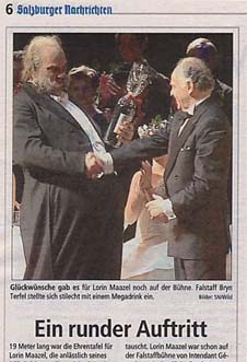 Salzburger Nachrichten 8/7付け記事にて「ロリン・マゼール、ザルツブルク・フェ スティバル出演100回!を祝う」