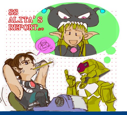 -Alita's reportより- presented by JALOD(FANG)/2001/03/10 90殿のSS「Alita's report」の一場面を描いた イラストです。 アリタにロボ-9、ロボ-9が思い浮かべているのは シャウ−エッセンですね。 アリタはデスクワークで退屈気味?