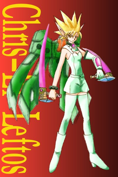 れいな殿の持ちキャラ「クリス」のイラストです。 CG初挑戦だそうです。 金の瞳に鋭い目つき+シノワビートブレイド… 強そうですねっ。 グリーンでのトータルコーディネイトです。(^^)